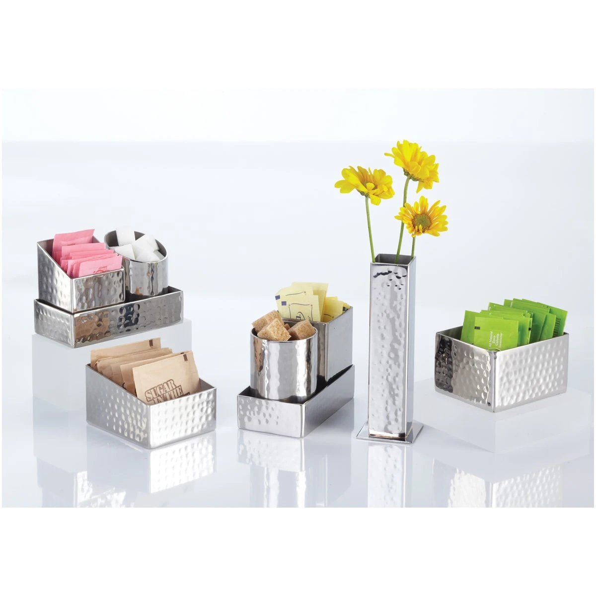 This hammered stainless steel bud vase makes a bold statement, add some flowers and your table will look great.