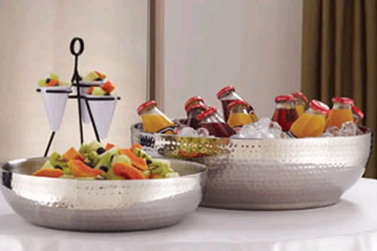 These extra-large, 657 ounce stainless steel bowls with double wall construction are perfect for cold drinks, fresh fruit or salads. They have an attractive hammered finish.