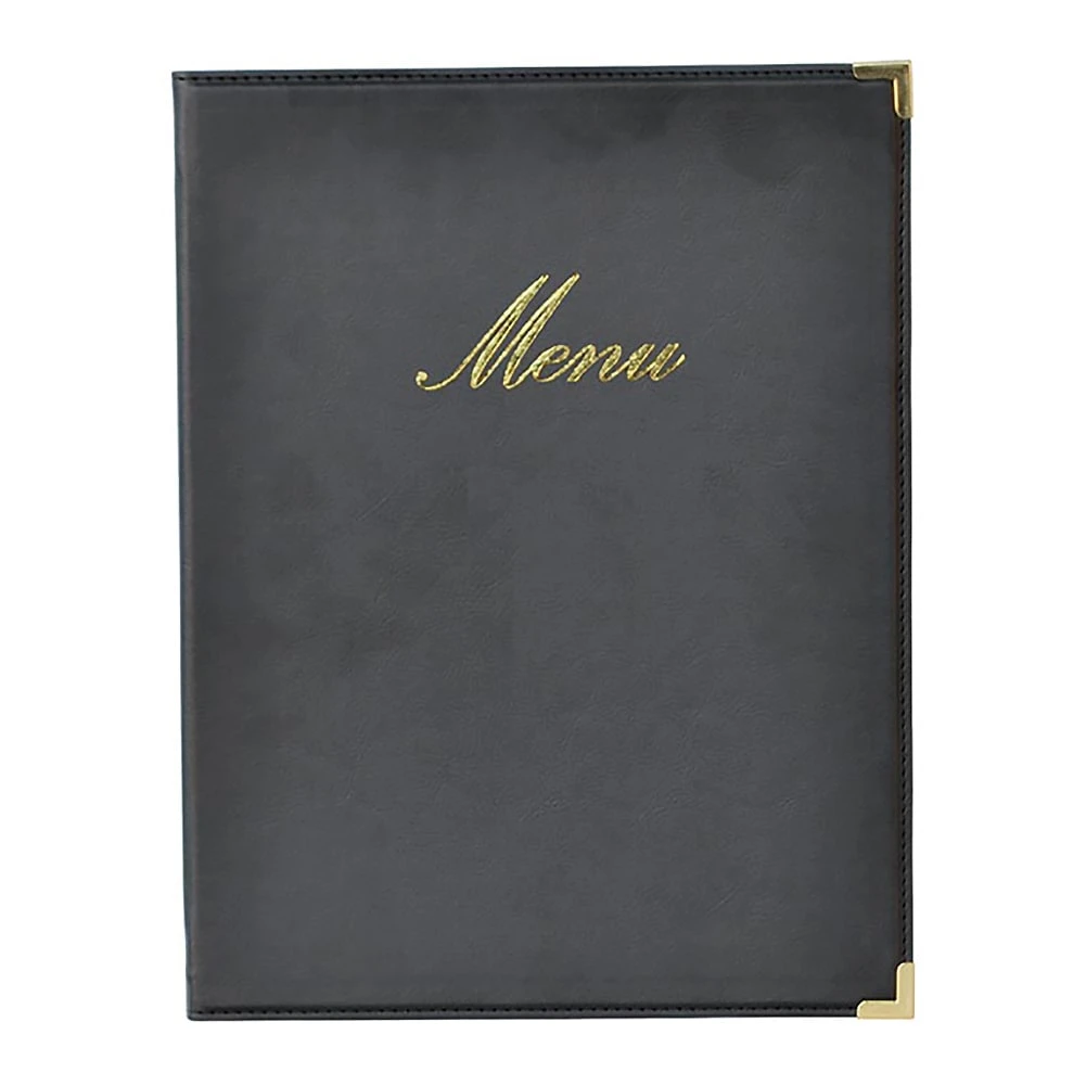 This 10″ x 13″ menu cover from American Metalcraft features a faux leather finish with gold lettering, gold corner reinforcements, an elastic cord, and a two-page plastic insert.