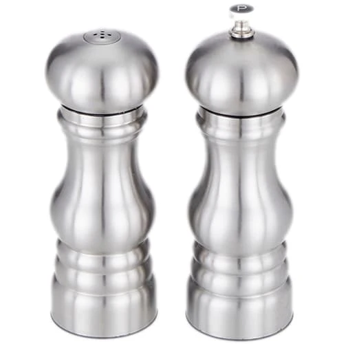 This salt and pepper set from American Metalcraft features durable stainless steel construction and will add a modern look to any table!