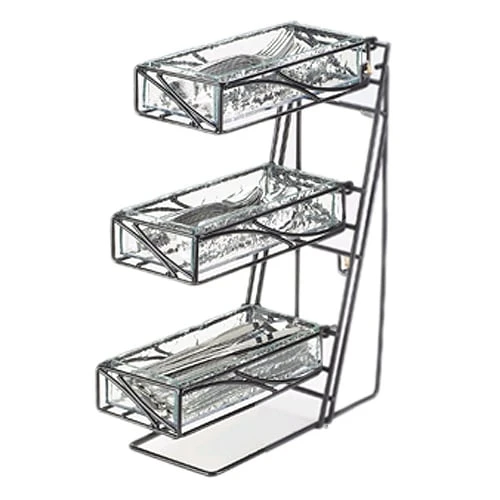 Cal‐Mil manufactures 1,000 plus products to dispense, display, protect, merchandise, serve, dress up and organize foods and beverages. This Cal‐Mil 3 Tier Wire Silverware Holder has 3 Removable Faux Glass Bins.