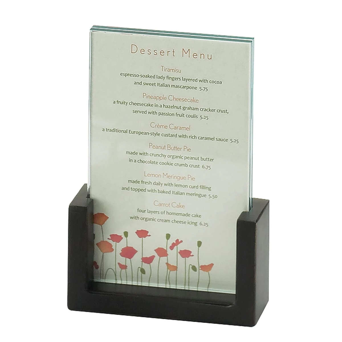 You can elegantly display your menus or specials cards with this U‐Frame tabletop card holder that features a dark midnight design. This 4″ x 6″ card holder from Cal‐Mil is stylish and modern and will complement any restaurant, buffet, or catered event.