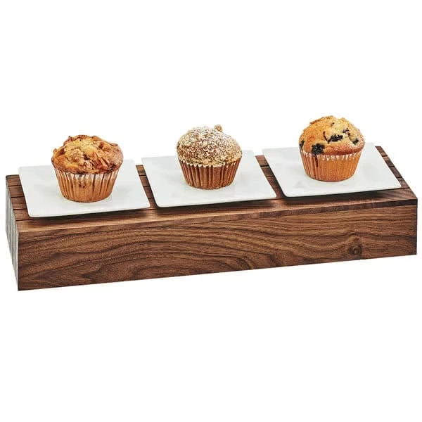 Add elevation and style to your food presentation with this 20″ x 7″ rectangular walnut riser from Cal‐Mil. It is part of the Mid‐Century Collection and will stand out among other risers with its symmetric grooves and warm walnut wood. Perfect for restaurants or buffets.