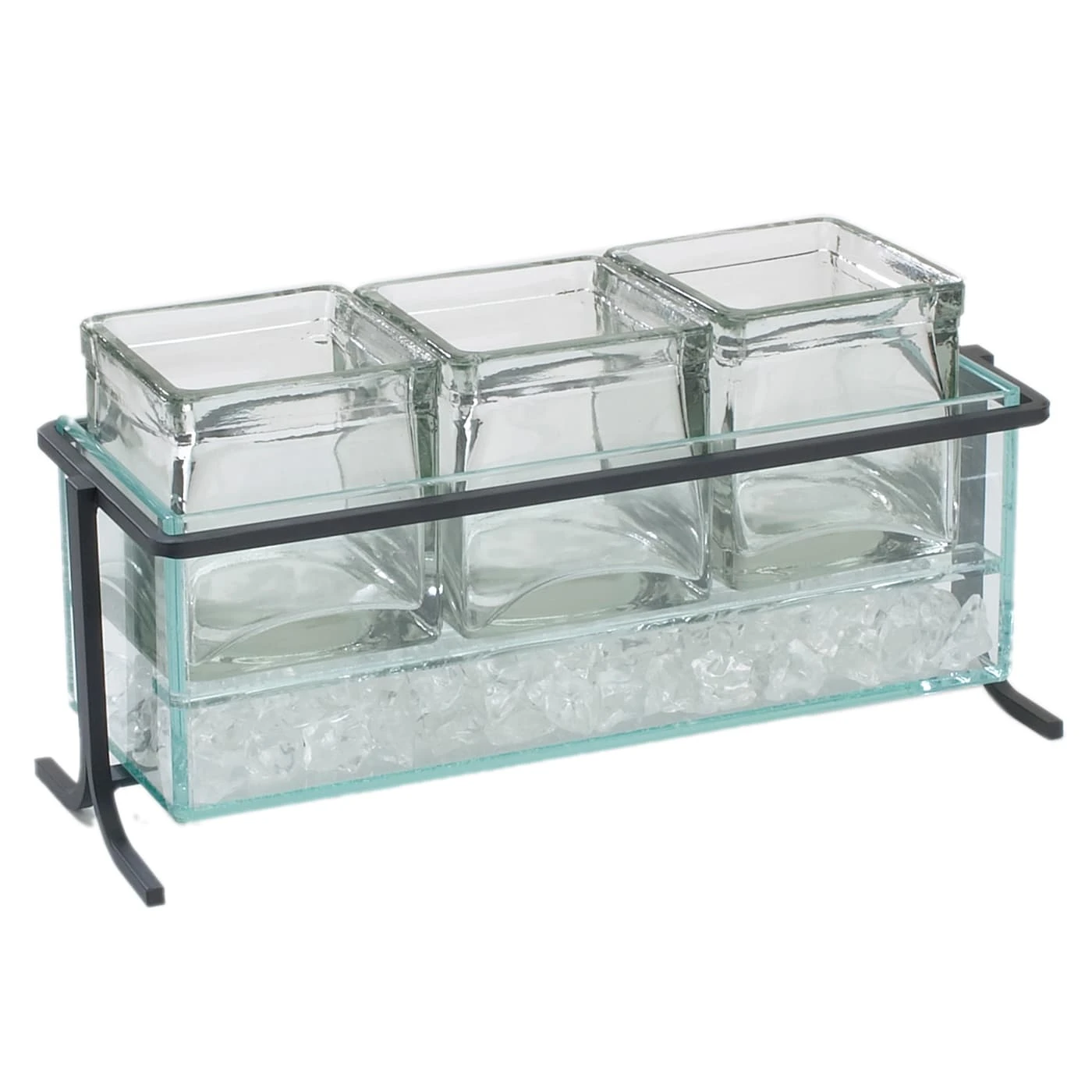 This Cal‐Mil Condiment Display features a black steel frame and includes three 5″ glass cubes.