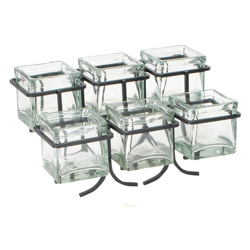 This Cal‐Mil Condiment Display has a Black Matte Coated Steel Frame and six 4″ Glass Cubes.