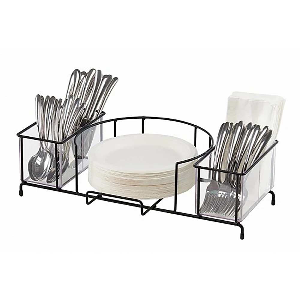 The Iron Plate and Napkin holder is an all-in-one solution for servingware! With plenty of space to fit plates up to 12″ in the center, it includes plastic inserts on each side to place napkins and silverware to ensure that tabletops remain open and not cluttered.