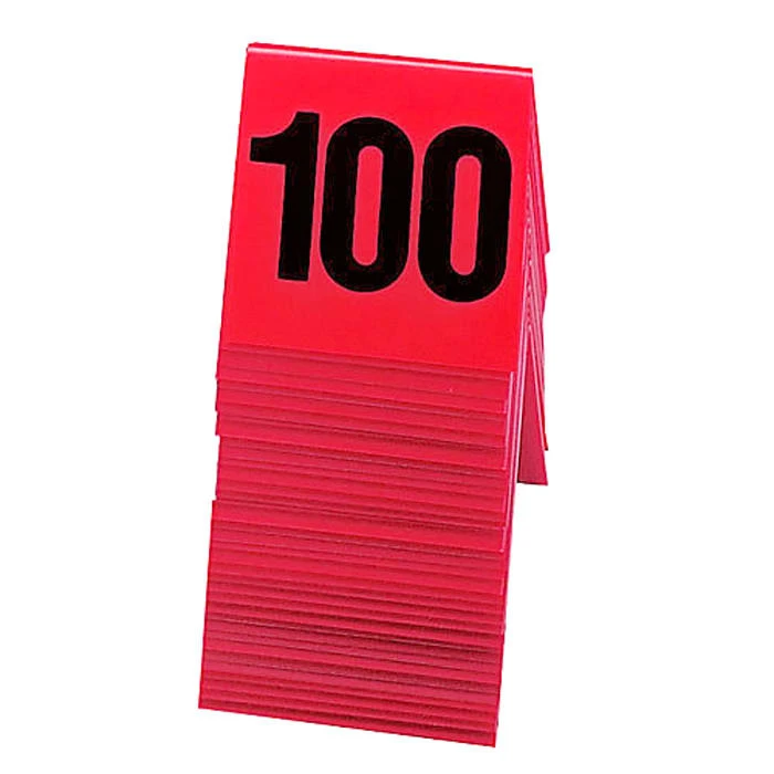This Cal‐Mil Set of Table Tents has numbers 76‐100. The table tents are red with black numbers, and are printed on both sides.