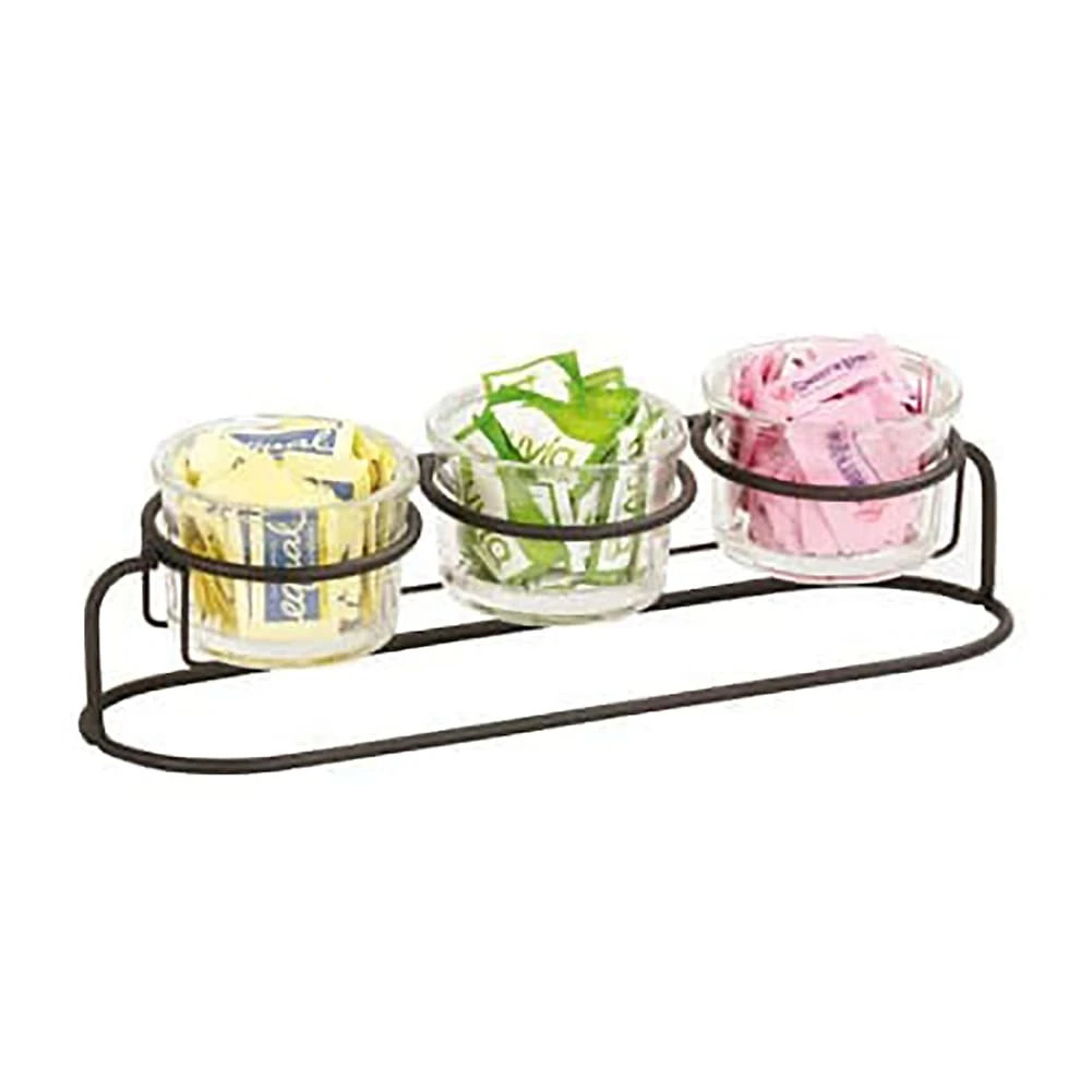 This sleek wire jar holder from Cal-Mil displays three, 16 ounce round glass jars in an elevated, modern design.