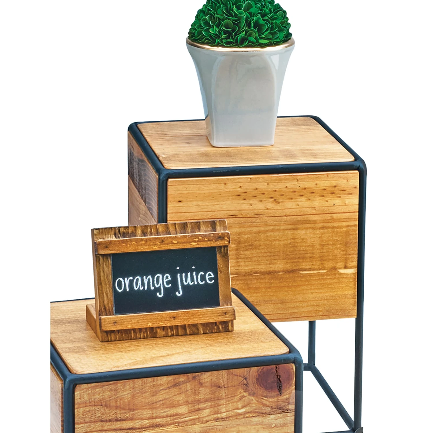 Add a unique look to your display with this paneled Madera Industrial Riser from Cal‐Mil. The flat black metal frame makes sure that your presentation stays in place, while the reclaimed wood panels add ex tra rigidity and contrast.