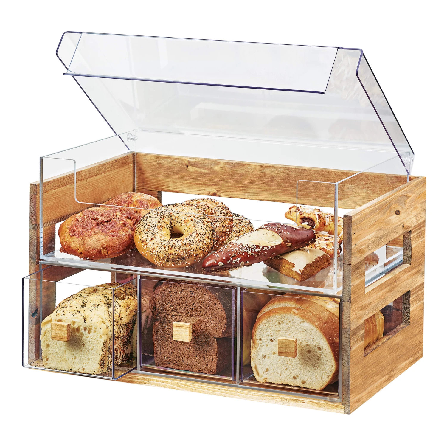 This Madera 2‐tier bread display from Cal‐Mil is the perfect way to neatly organize breads. It includes 3 drawers for loaves of bread, and a top section for bagels or other pastries. The side cutouts allow light to fill in the case so guests can see in perfectly.