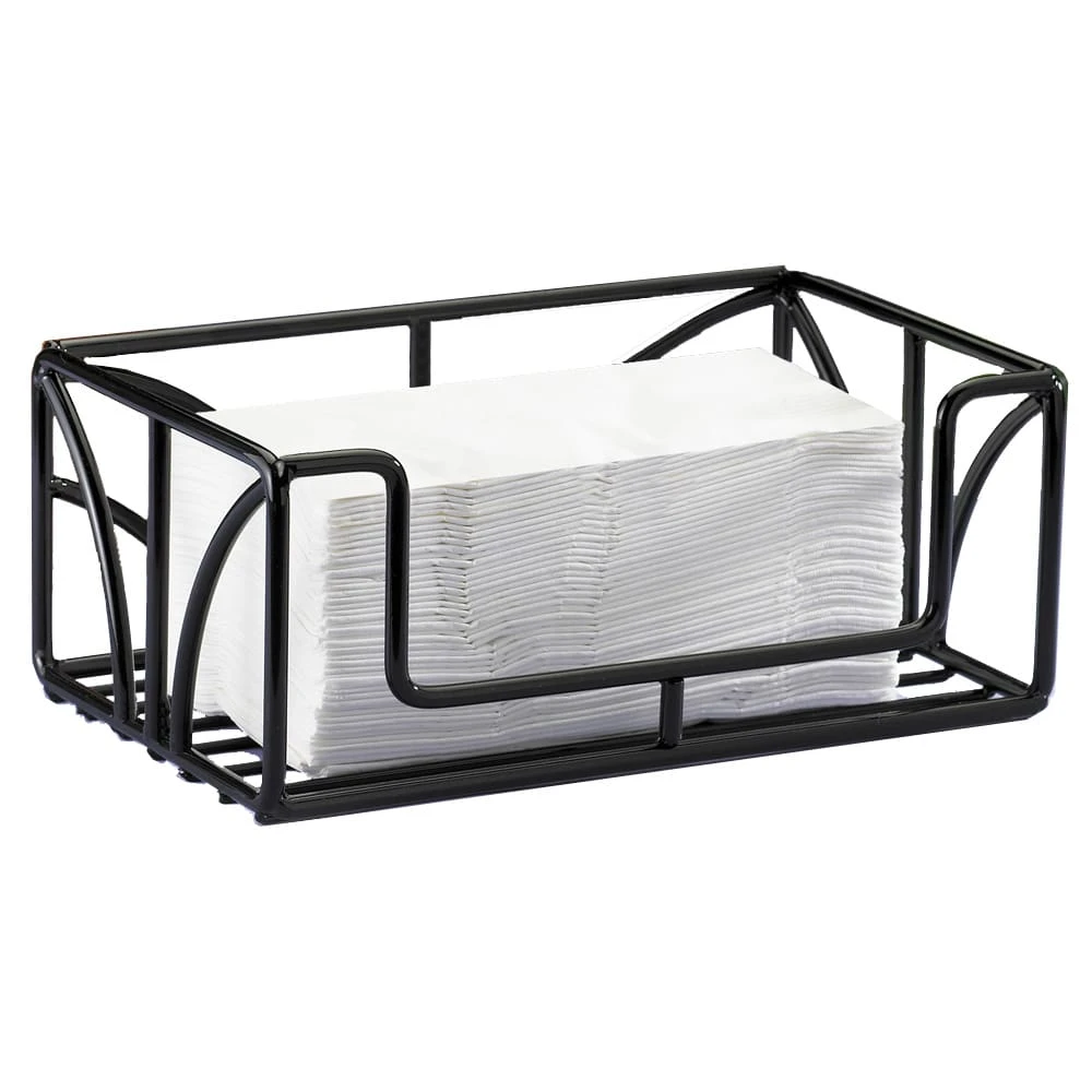 This paper towel holder is constructed of durable black powder coated steel with the look of wrought iron. Great for use in restrooms or hotel rooms.