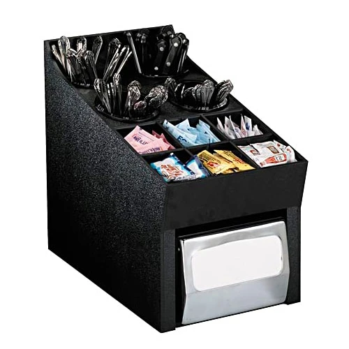 This Dispense-Rite Organizer is perfect for holding condiments, flatware, straws, napkins, and more. It features black polystyrene construction and is ideal for self-serve areas.