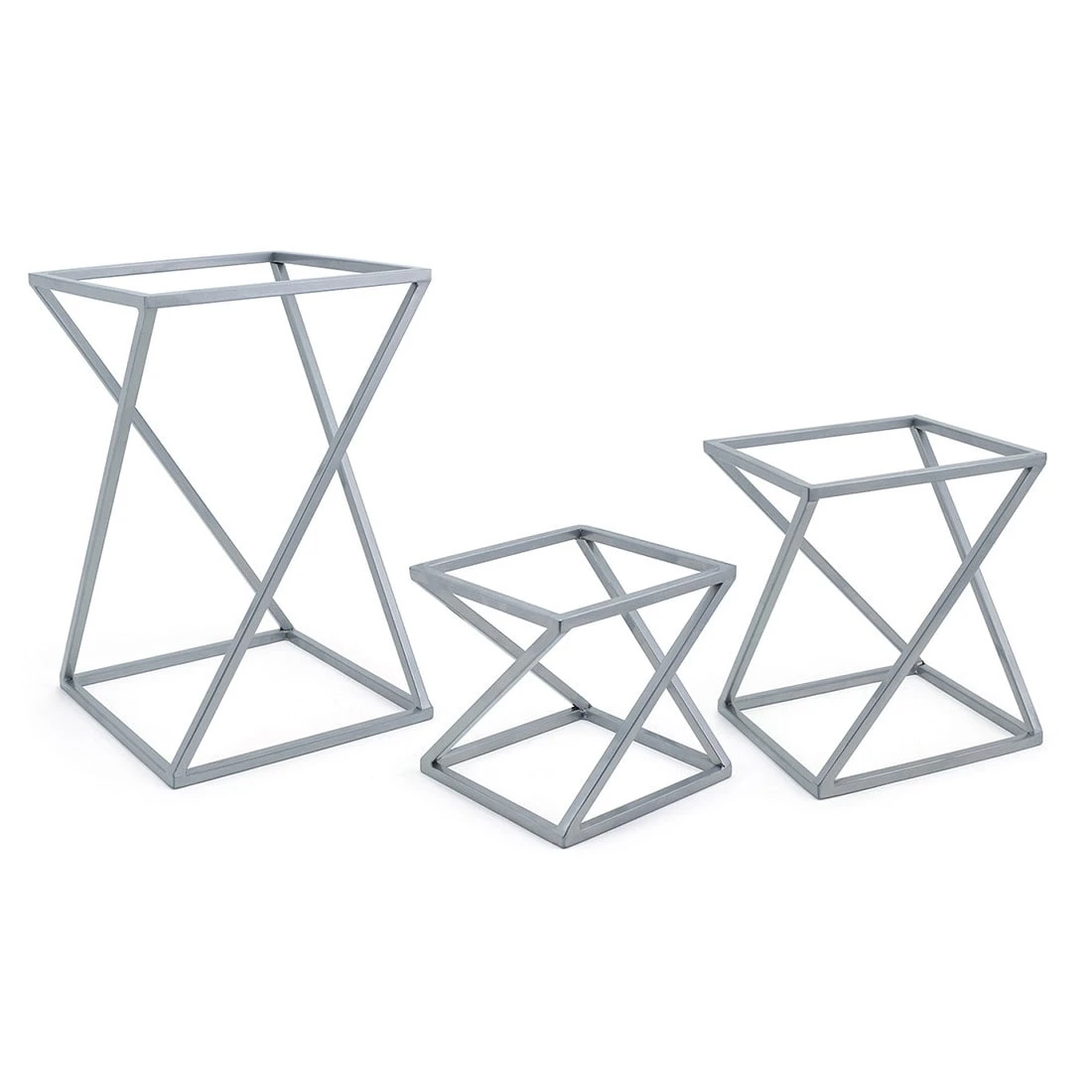 These Front Of The House® B3® Twist Risers are great for buffet displays and catered events. They come in a silver color and are three different sizes.
