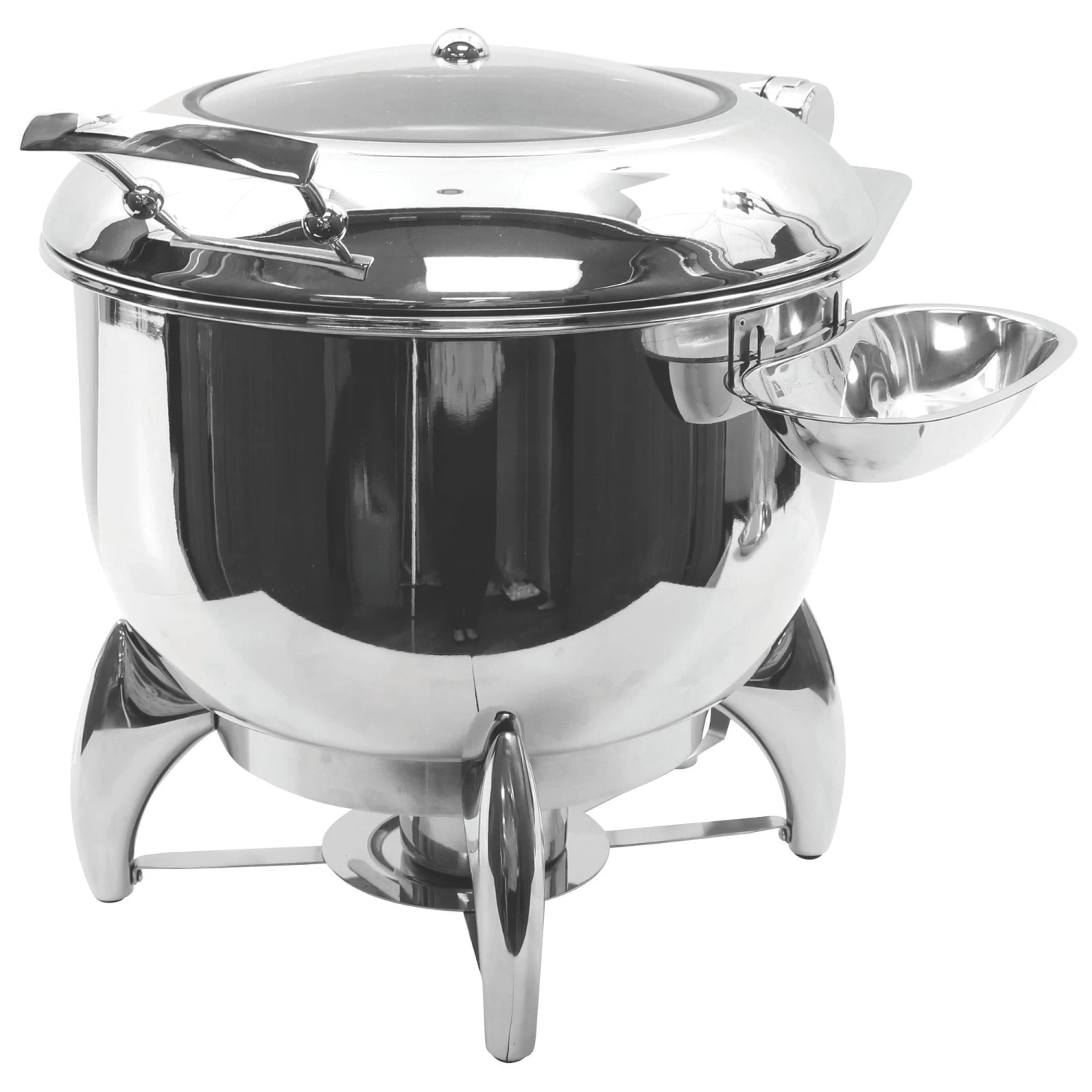 This Quick‐View Soup Server from TableCraft features a glass window that allows guests to view the contents without lifting the lid, which keeps the contents hotter, longer. It has a beautiful stainless steel polished exterior that adds elegance to any buffet line