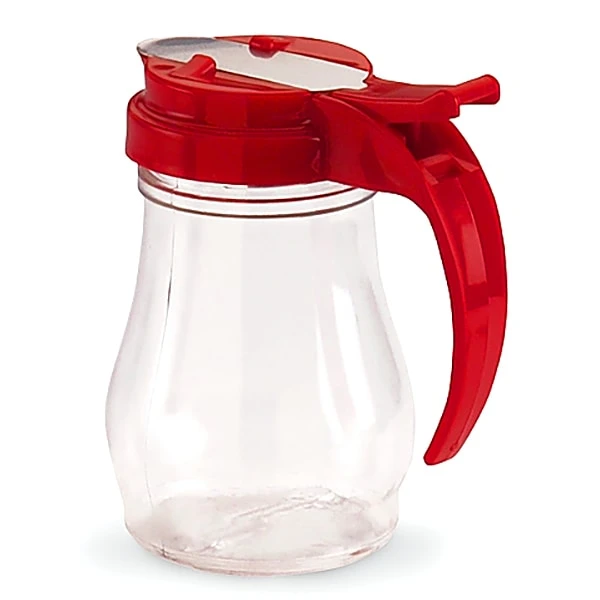 This 7 ounce syrup dispenser from Vollrath® features durable polycarbonate construction with a red top. Perfect for serving syrup at individual tables.