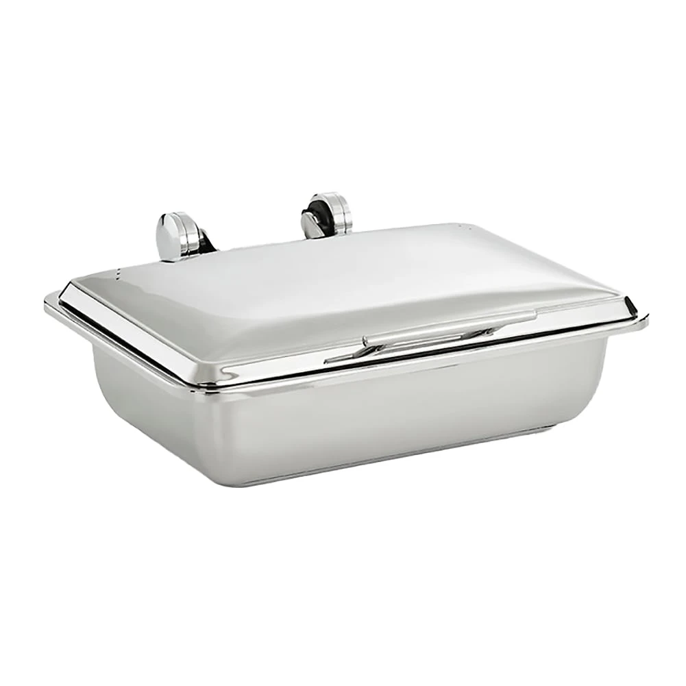 Designed for use with Vollrath induction buffet warmers (sold separately), this induction chafer enhances your food presentation with its beautiful mirror‐finish. It come complete wit a Super Pan V stainless steel food pan, a self‐closing lid, and a detachable cover. Reinforced brackets and rubber table feet ensure stability during service, and the 8‐quart capacity reduces the need for frequent refills. You can also pair this chafer pan with a silicon induction mat (sold separately) to hold the pan in place.