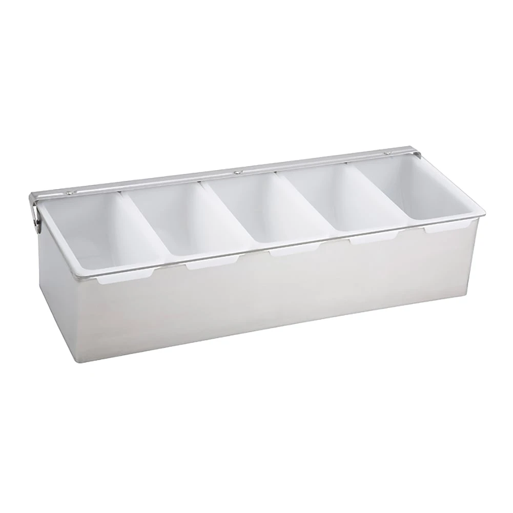 This 5-compartment condiment holder from Winco® features a stainless steel base and is great for use in bars!