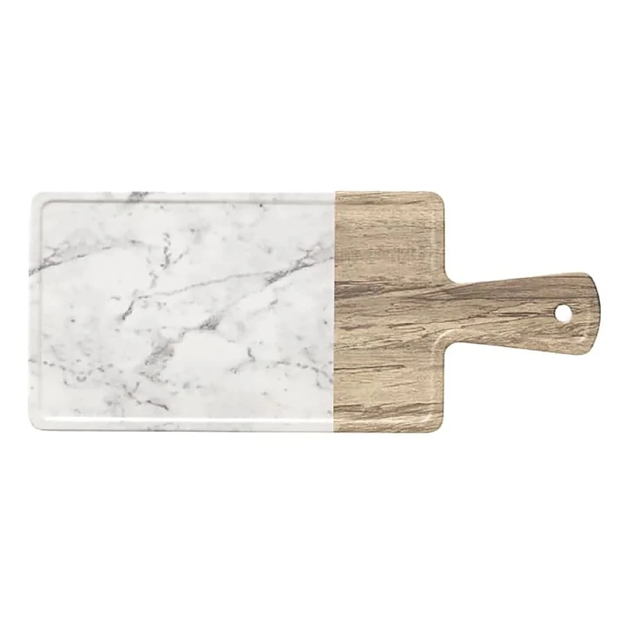 Serve breads, fruit, cheese and more on this 12″ x 7″ serving board from World Tableware. This serving board features the elegant look of wood and marble but is actually made from durable melamine!